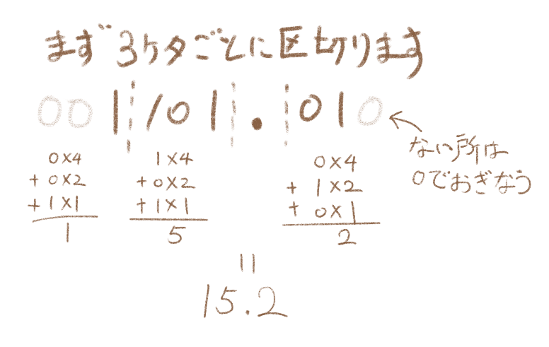 以下のように少数部分の重みを逆にしてしまう間違いがあるので注意しましょう。整数部分も少数部分も重みの順番は変わりません。
